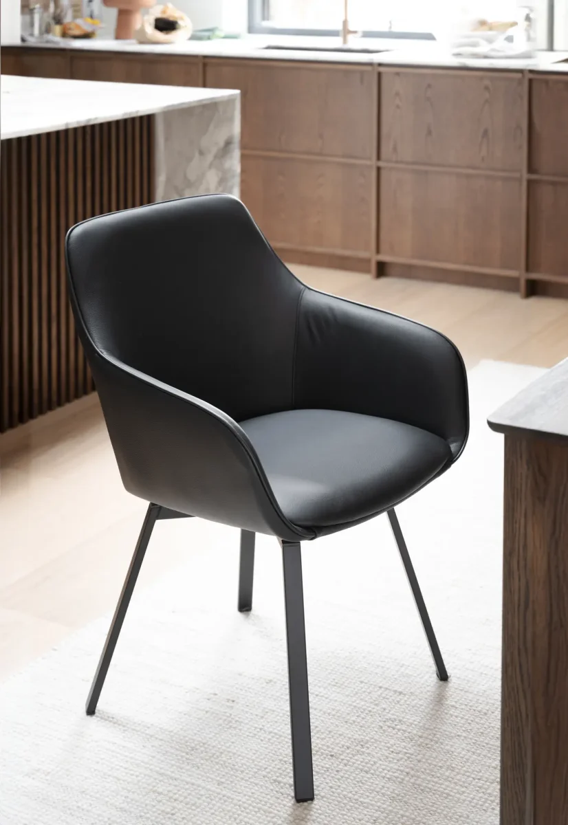 Alison karmstol i beige läder har precis som populära Alison stol ett snurrbart underrede i 360 grader. Den kupade stoppade sitsen och de höga armstöden gör stolen bekväm och ombonad att sitta i. Alison karmstol med svart metallunderrede gör det lätt att matcha karmstolen med andra möbler i hemmet. Träet inuti sitsen består av 100 % FSC®-certifierat trä