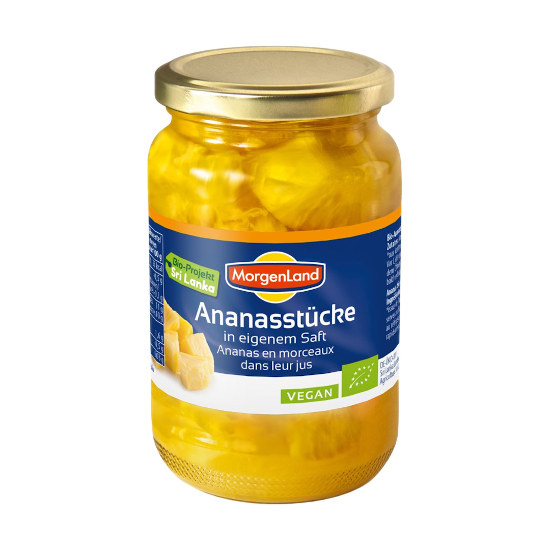 Endast friska och väl mogna frukter väljs ut. Tillsatsen av ananasjuice ger en subtil sötma med balanserad surhet, vilket gör ananasen ännu fruktigare. En delikatess: antingen som den är eller som en ingrediens i kakor, müsli eller yoghurt. Skydda mot ljus och värme! Förvara i kylen efter att den öppnats och förbrukas omgående.