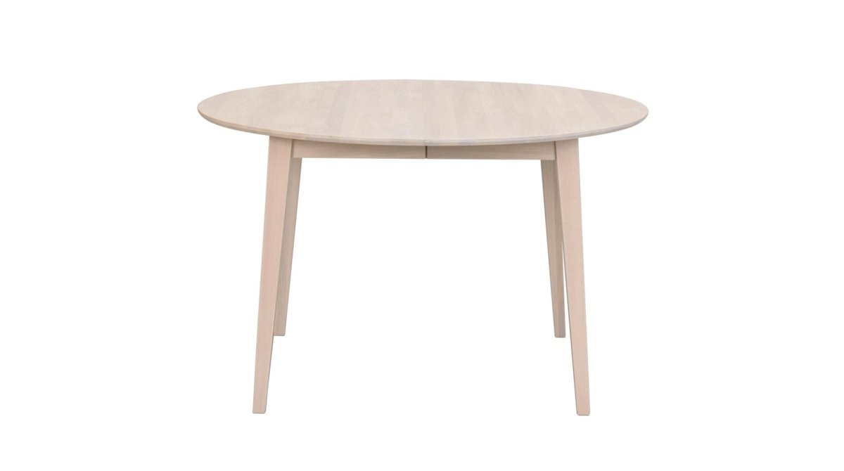 Praktiskt matbord i smidigt runt format med en diameter på 120 cm. Det går att förlänga till 165 cm tack vare en medföljande iläggsskiva, och det går även att köpa till ytterligare ett 45 cm ilägg. Bordets maxlängd blir då 210 cm. Bordet består av massiv fingerskarvad ek som behandlats med vitpigmenterad olja.
