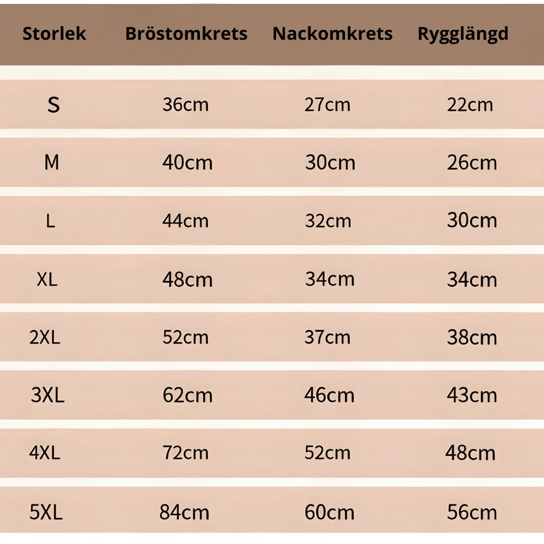 Mät bröstkorgens bredaste del och ryggens längd. Ligger din hund mellan två storlekar? Välj den större för bäst rörlighet.