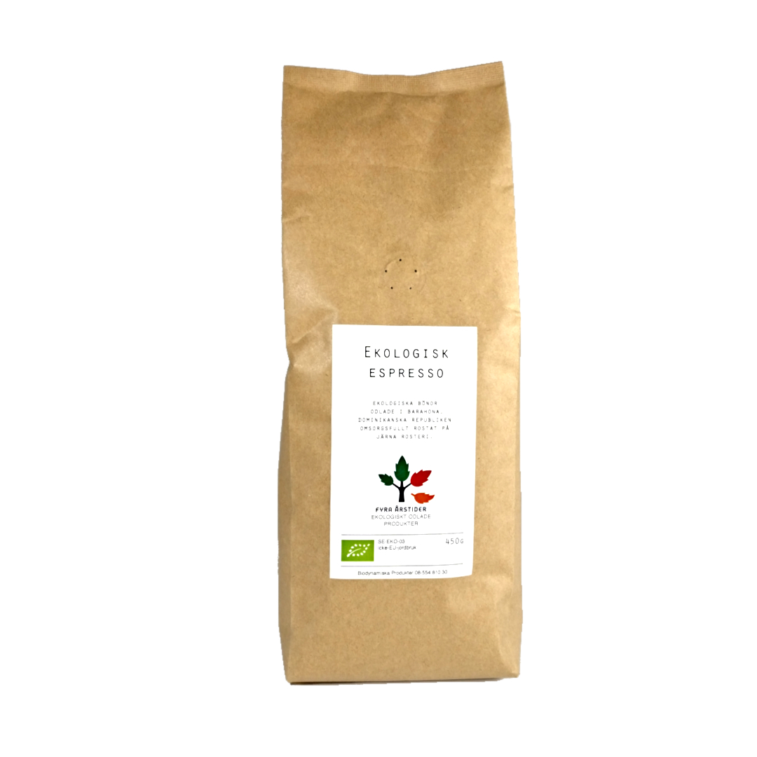 Espresso-rostade ekologiska hela Arabicobönor från Dominikanska Republiken. Bönorna är rostade på Järna Rosteri. Innan malningen känns den som en ganska hårdrostad och kraftfullt doftande böna. Mald har den en stor, fyllig och rostad doft som hänger kvar också när kaffet är klart. Smaken är fyllig och fin, inte för skarp eller syrlig, snarare stor och rund. Vacker mörkt rödbrun färg. Gott att dricka som det är, helt svart, men passar även med en skvätt varm mjölk.