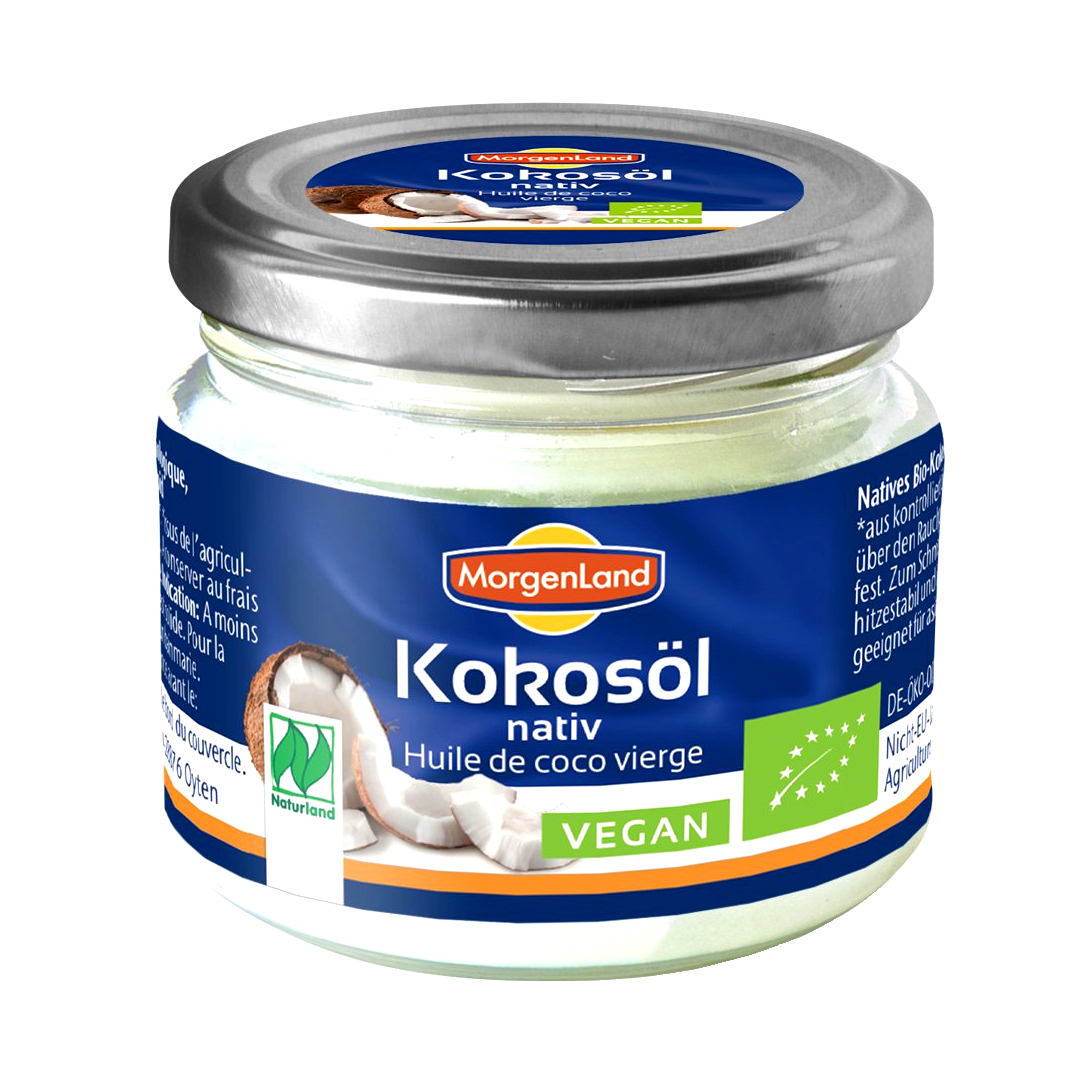 Kallpressad kokosolja. Den är fast under 25°C. Smält den genom att ställa burken i vattenbad. Kokosolja passar bra till bakning och stekning/wok. Det vita kokosköttet från mogen kokosnöt är torkat 2-3 min i 50°C och sedan kallpressat. Förvaras mörkt, torrt & svalt.