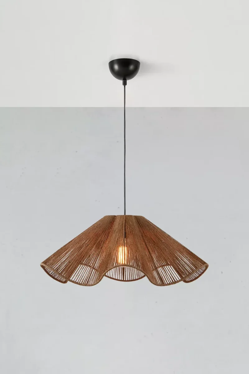 ProduktspecifikationBeskrivning: Nami är en dekorativ taklampa med handsnörad textilskärm i naturfärgat jutetråd. Lekfulla och mjuka former i rustik still. Skapar ett fint blickfång i rummet med en synlig ljuskälla. Välj gärna en dekorativ ljuskälla med stor sockel (E27) för att sätta din personliga prägel på lampan. Trådarna är handsnörade vilket kan innebära mindre avvikelser mellan exemplaren. 150cm lång svart textilkabel och svart takkopp. Lampan har en diameter om 60cm och höjd om 24cm. Passar fint ovanför ett runt bord eller i sovrummet. Finns även i svart. Tekniskt: Lampan kräver en ljuskälla med stor sockel (E27) om max 40W eller motsvarande i LED, ingår ej. 150cm lång kabel, takkontakt ingår ej. Krokupphäng. |