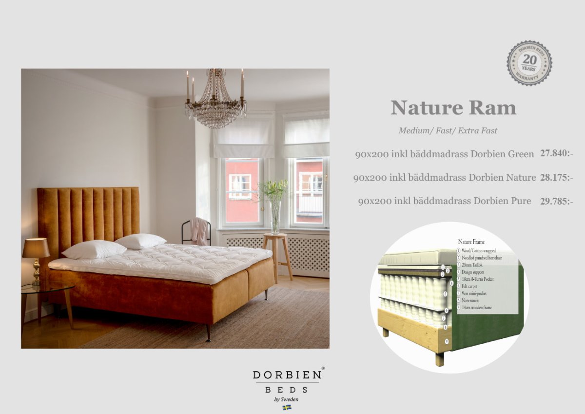 | Jag har alla goda egenskaper från naturen kombinerat med Skandinavisk design. Vissa skulle kalla min design retro eller en klassiker. Jag kallar mig helt enkelt för Nature ramsäng. Jag är här för att ge dig en fantastisk sovupplevelse. Jag har naturliga fiber så som tagel, ull och bomull. Min komfort är helt enkelt en av de allra bästa när det kommer till ramsängar. Du tror mig inte? Prova mig och upplev det själv. |