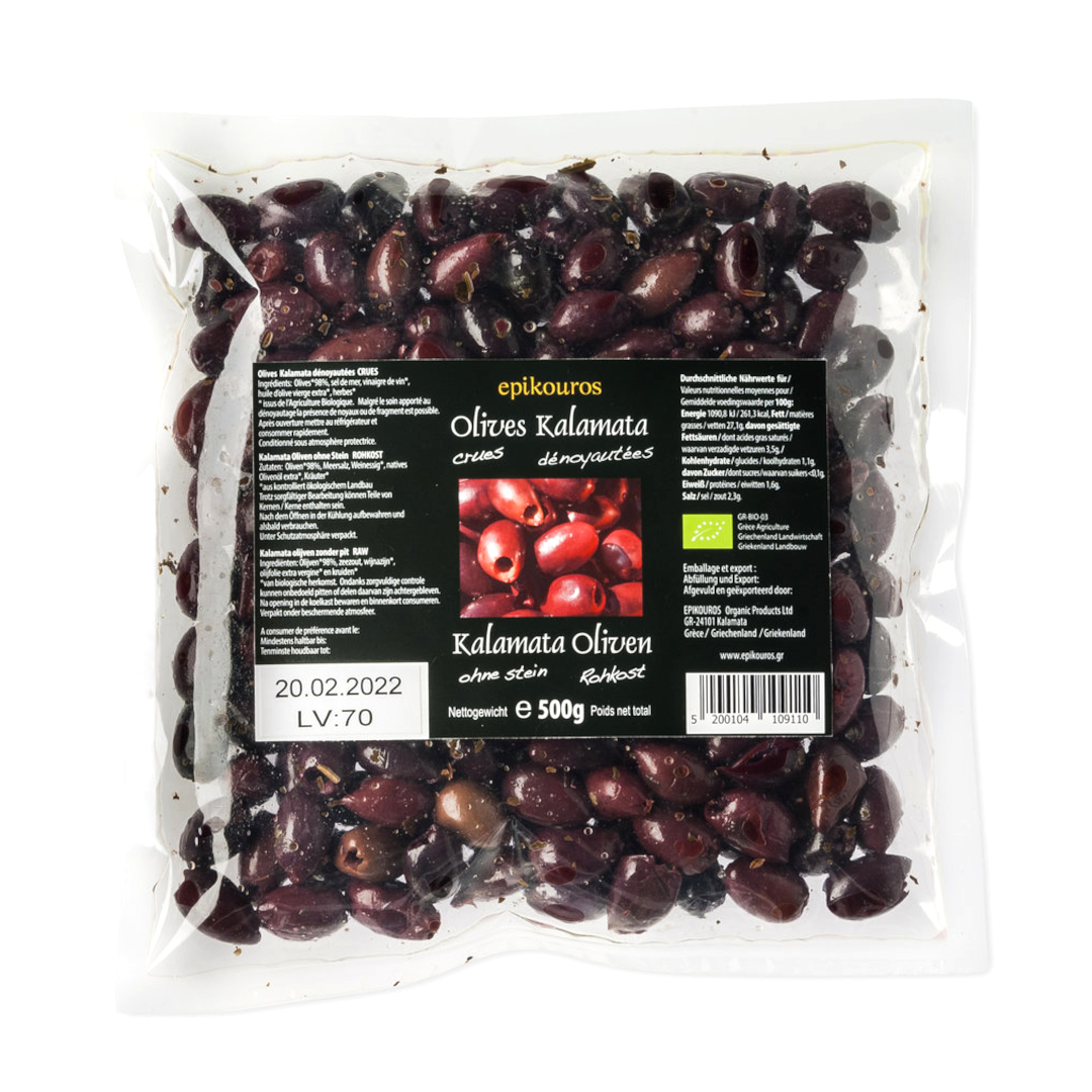 Urkärnade Kalamataoliver, marinerade i olja och kryddor. Opastöriserade (raw).