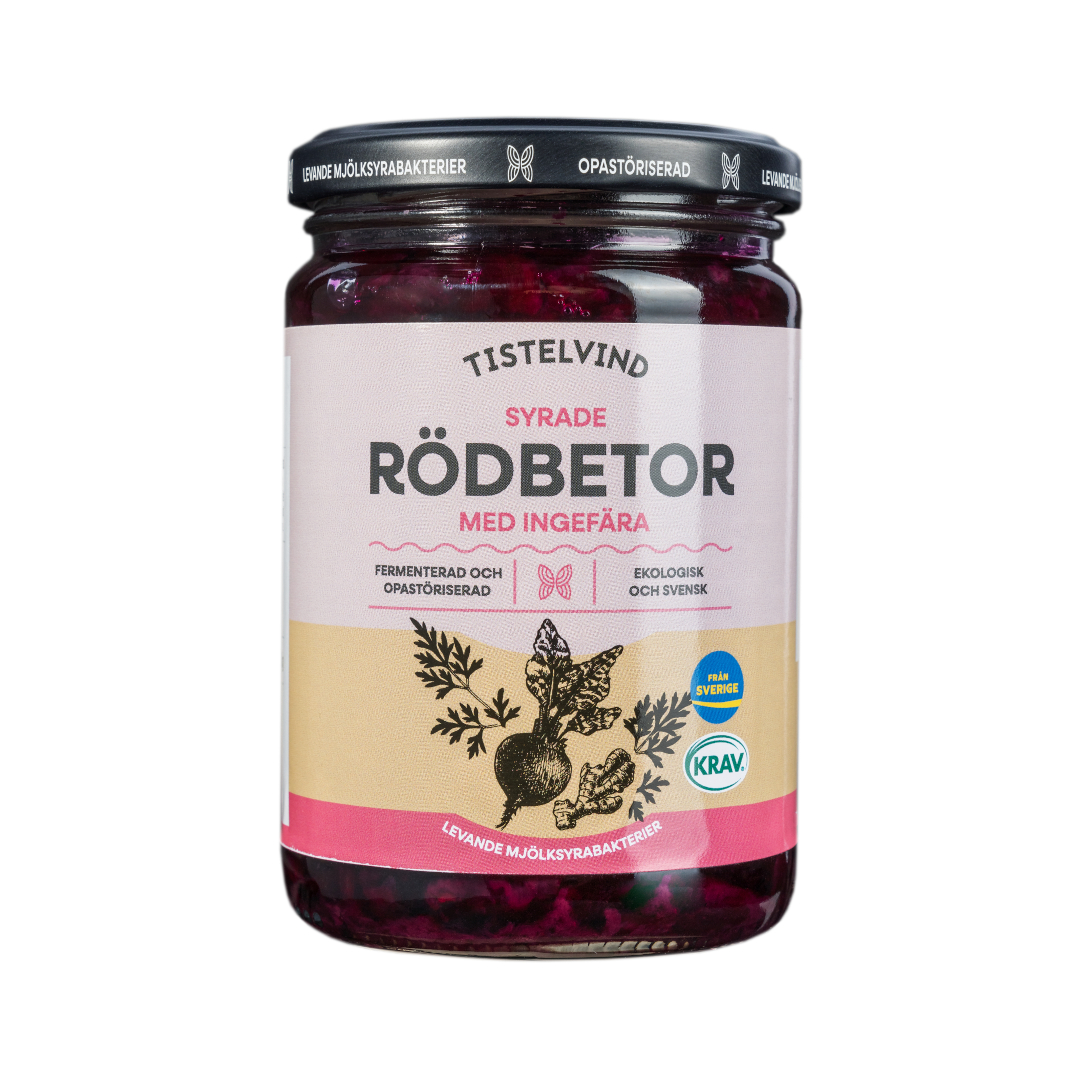 Naturligt syrade rödbetor med rund och mjuk smak men med ett sting av ingefära.