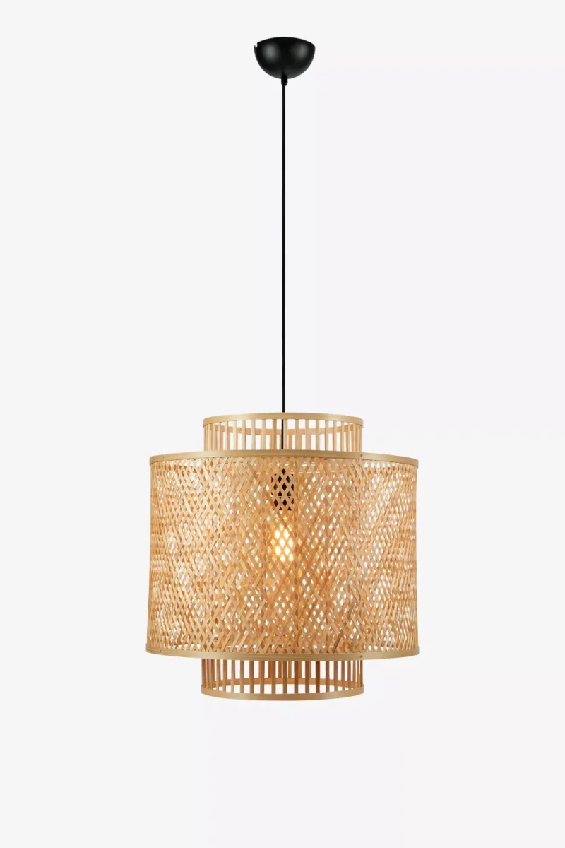 Beskrivning: Cylinderformad taklampa i handflätad, naturfärgad bambu. Lampan är flätad för hand vilket ger varje exemplar ett unikt utseende. Lampan har en diameter om 50 cm och passar fint ovanför ett runt bord. Välj en klar ljuskälla för spännande skuggspel genom bambustråna. Svart textilkabel om 150cm och svart takkopp. Finns även i mattsvart. |